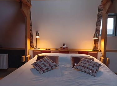 Zeer ruime kamer in jaren 70 stijl. Voorzien van twee eenpersoonsbedden (0,90m) die een groot tweepersoonsbed kunnen vormen, een kleine zithoek en een originele badkamer met een groot ligbad, een inloopdouche, een grote wastafel en een apart toilet. Gelegen op de 2e verdieping.