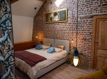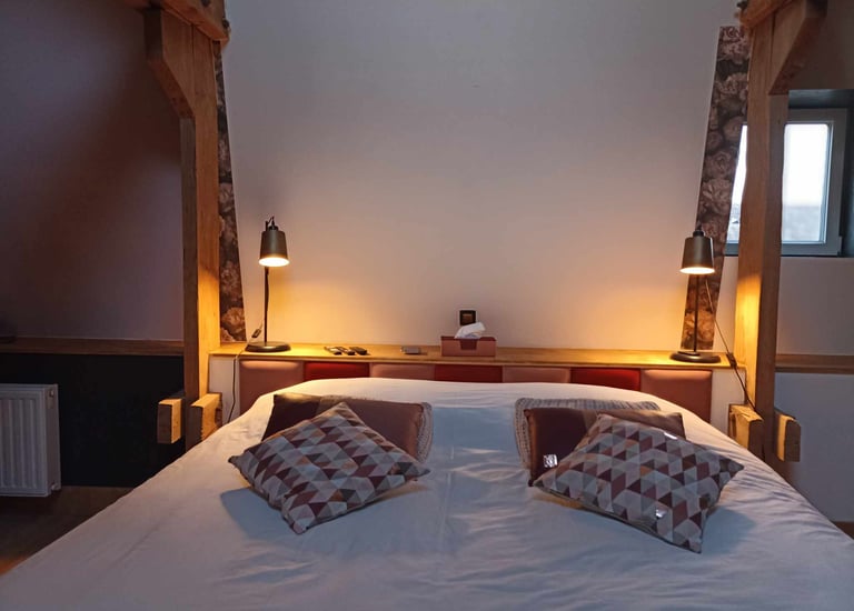 Zeer ruime kamer in industriële chique stijl. Uitgerust met een groot tweepersoonsbed (1,80 m), een zithoek en een badkamer met een groot en mooi ligbad, een inloopdouche, twee wastafels en een apart toilet. Gelegen op de 2e verdieping.